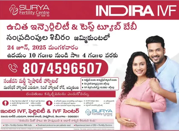 జమ్మికుంటలోని సంజీవని మల్టీ స్పెషాలిటీ ఆస్పత్రిలో (జూన్ 24, 2025) మంగళవారం ఉదయం 10 గంటల నుంచి సాయంత్రం 5 గంటల వరకు ఉచిత ఇన్ఫెర్టిలిటీ, టెస్ట్ ట్యూబ్ బేబీ క్యాంప్ ను నిర్వహిస్తున్నట్టు ఆస్పత్రి వారు తెలిపారు. సంతాన సమస్యలున్న వారు ఈ ఫ్రీ హెల్త్ క్యాంప్ నకు హాజరుకావాలని సూచించారు. రిజిస్ట్రేషన్ తో పాటు కన్సల్టేషన్, సెమెన్ ఎనాలిసిస్ ఉచితంగా నిర్వహించనున్నట్టు స్పష్టం చేశారు.