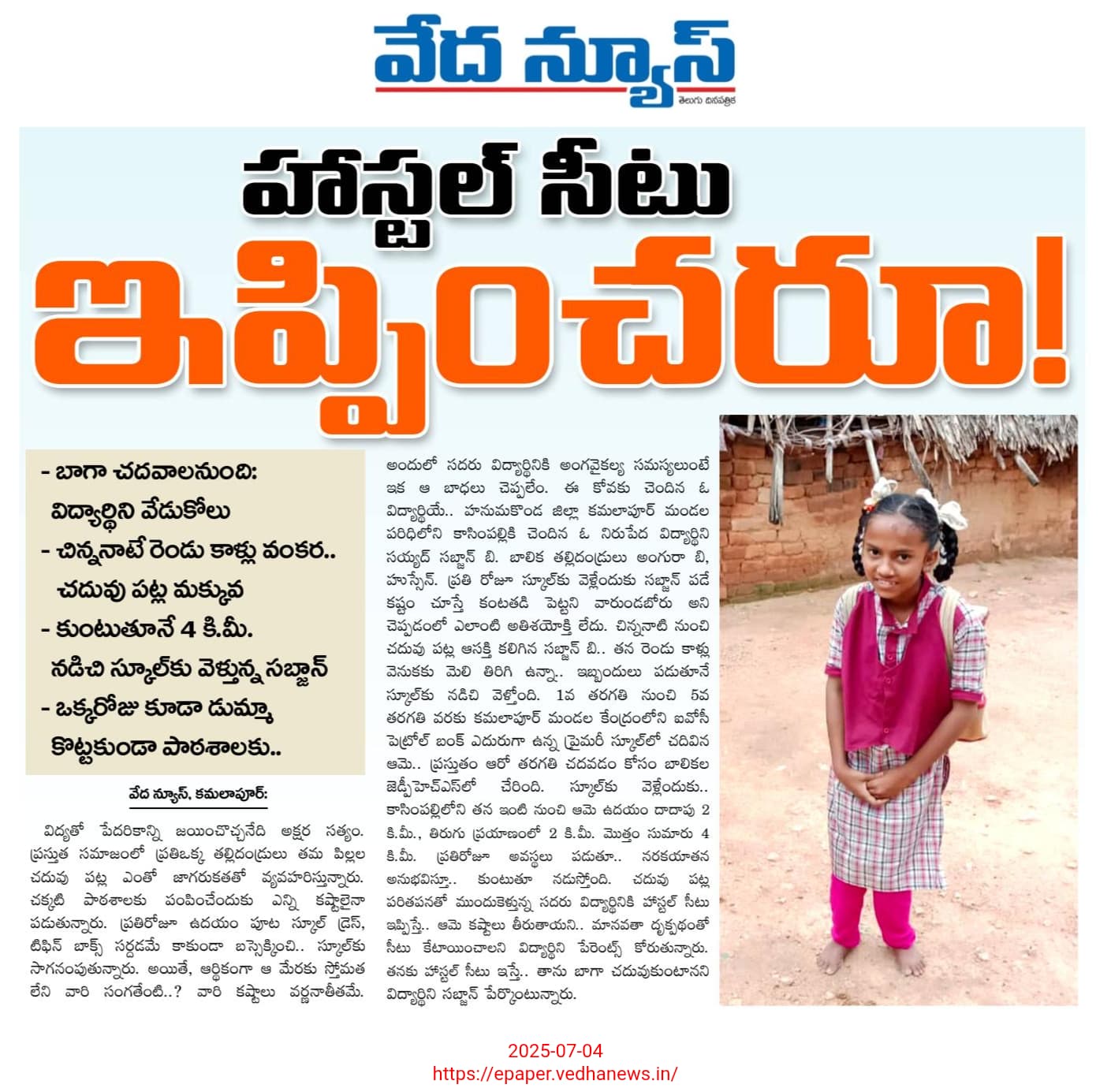 ఈ నెల 4న (శుక్రవారం) ‘వేద న్యూస్’ తెలుగు దినపత్రిక ప్రధాన సంచికలో ‘హాస్టల్ సీటు ఇప్పించరూ!’ శీర్షికన ప్రముఖంగా ప్రచురితమైన కథనానికి స్పందన లభించింది. హనుమకొండ జిల్లా మైనారిటీ సంక్షేమ అధికారి కే. ఏ. గౌస్ హైదర్ స్వయంగా ఆయనే.. కమలాపూర్ మండల పరిధిలోని కాసింపల్లిలోని విద్యార్థిని సయ్యద్ సబ్జాన్.బి. ఇంటికి వెళ్లి విద్యార్థినితో, బాలిక కుటుంబ సభ్యులతో మాట్లాడారు.