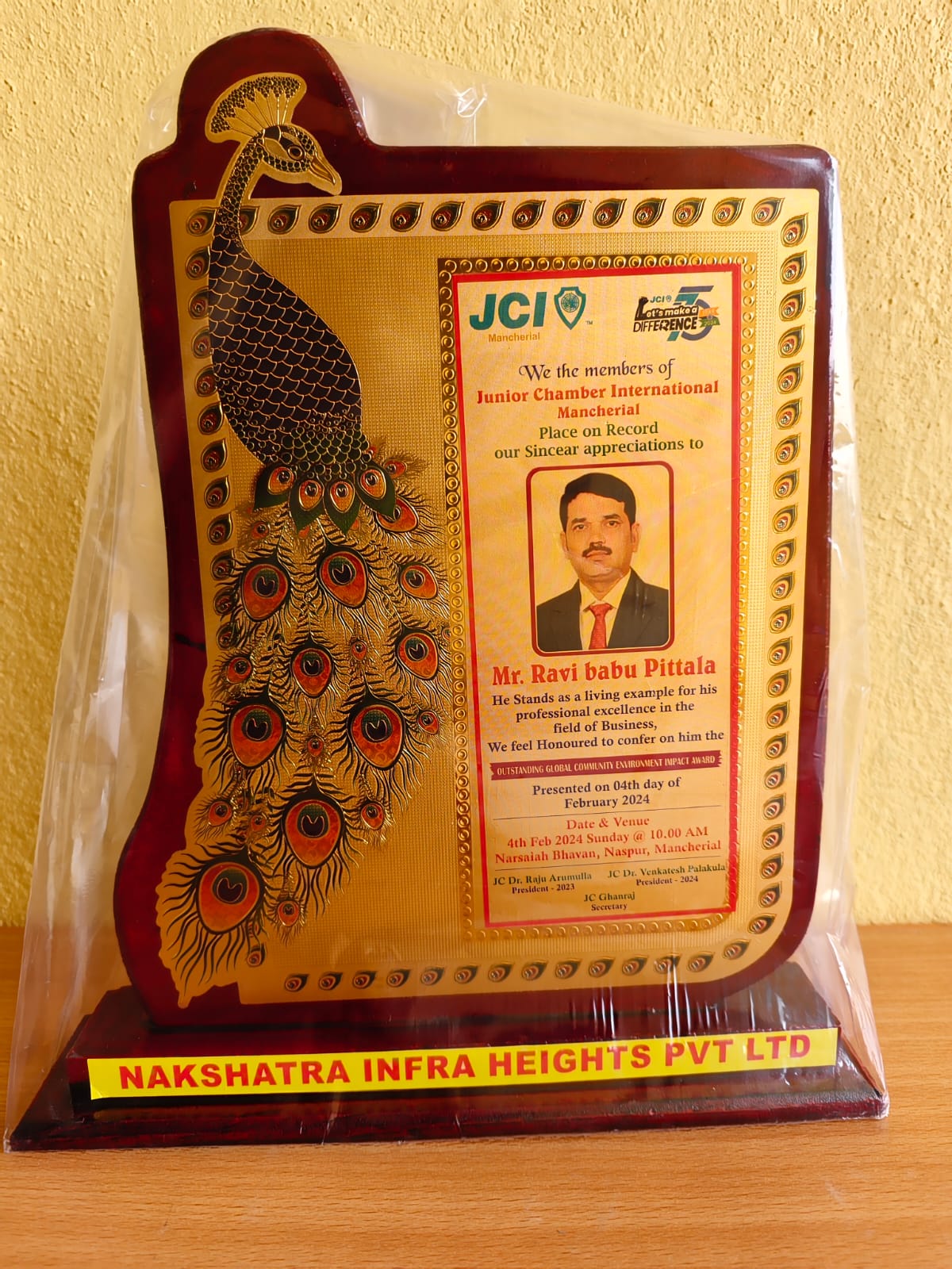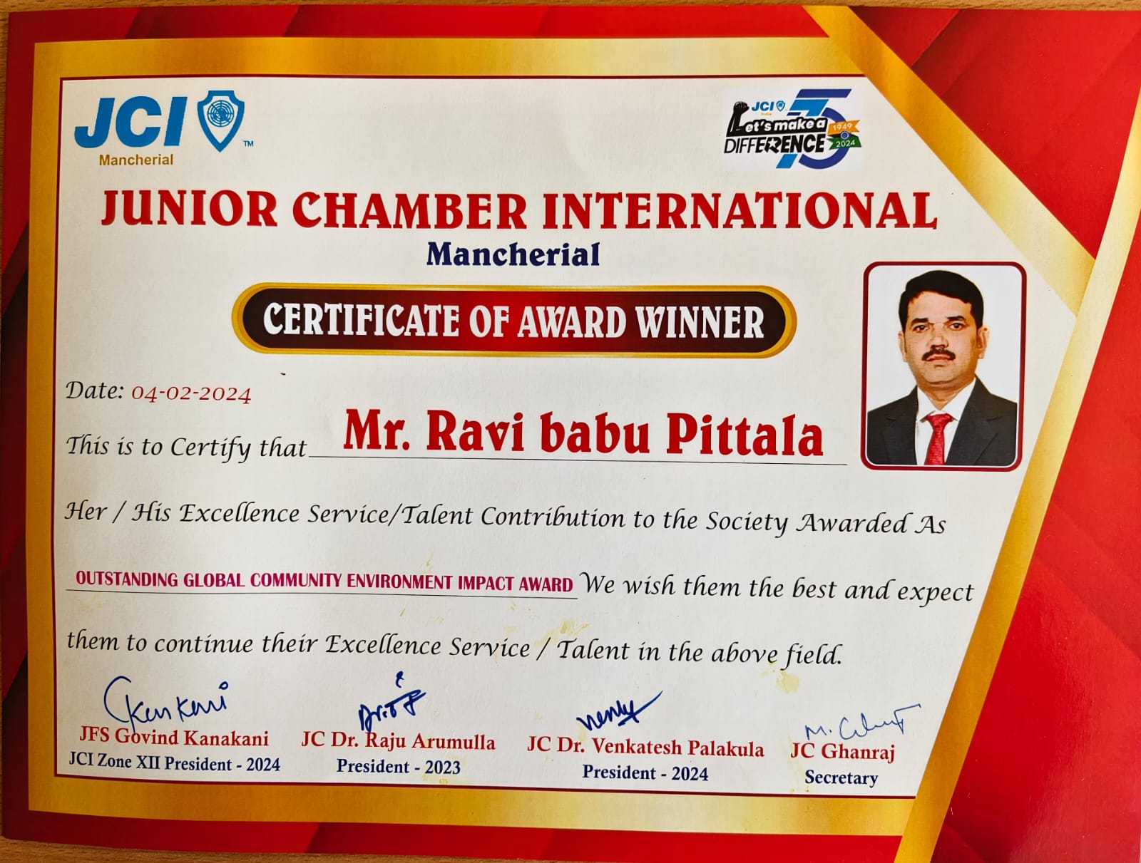జూనియర్ చాంబర్స్ ఇంటర్నేషనల్ ఆర్గనైజేషన్ (JCI) మంచిర్యాల్ చాప్టర్, ప్రతీ సంవత్సరం వివిధ రంగాలలో అత్యుత్తమ సేవలందిస్తున్న ప్రతిభావంతులను గుర్తించి అవార్డులను అందజేస్తోంది. ఈ నేపథ్యంలో 2024 సంవత్సరానికి ప్రతిష్టాత్మకమైన అవార్డును పర్యావరణ వేత్త పిట్టల రవిబాబుకు ఆదివారం అందజేసింది. సొసైటీకి అద్భుతమైన సేవా సహకారం, సేవాలు అందిస్తున్న వారికి ప్రోత్సాహంగా అవార్డులను ఈ సంస్థ ఇస్తోంది.