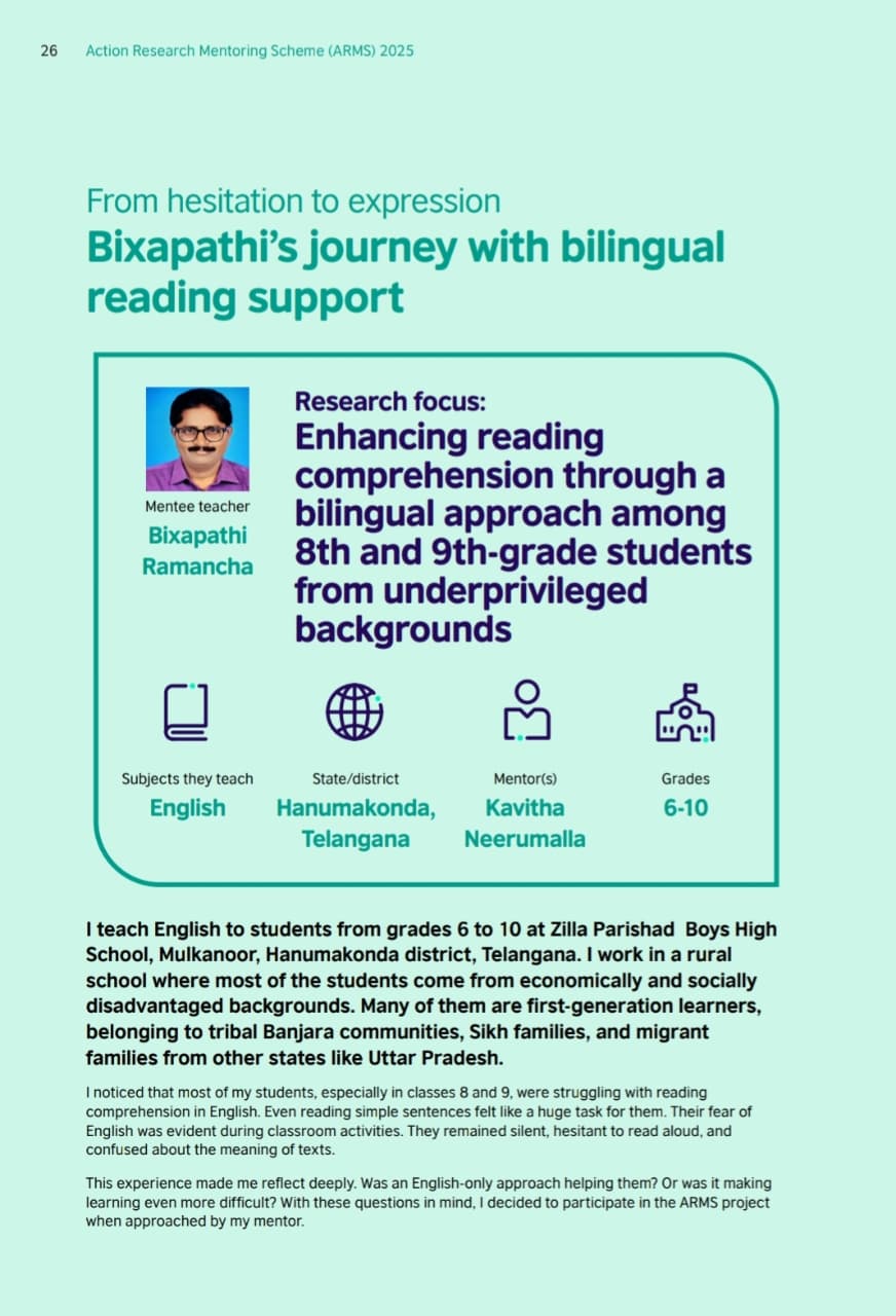 బ్రిటిష్ కౌన్సిల్ యాక్షన్ రీసెర్చ్ మెంటారింగ్ స్కీం (ఏఆర్ఎంఎస్ ) ప్రాజెక్ట్ ఎన్ఐటీ వరంగల్, ఐఐటీ డీఎం కాంచీపురం, గౌహతి, యూనివర్సిటీస్ సహకారంతో ప్రభుత్వ ఉపాధ్యాయులకు వారి తరగతి గదులలో ఇంగ్లీష్ బోధనలో వచ్చే సమస్యలను ఏ విధంగా పరి ష్కరించాలో పరిశోధన పరిష్కారాలను కనుగొని బ్రిటిష్ కౌన్సిల్ ఆధ్వర్యంలో చెన్నయ్లో వారి పరిశోధనలు ప్రజెంట్ చేశారు.