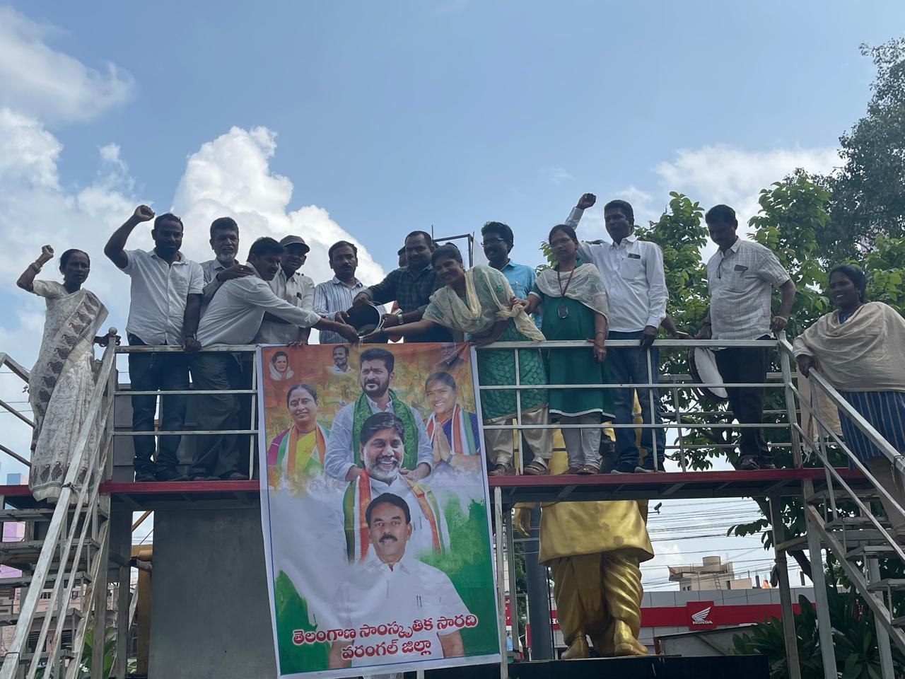 కాంగ్రెస్ ప్రభుత్వ ప్రజా పాలనకు పాలాభి షేకం నిర్వహిస్తున్నట్లు వరంగల్ జిల్లా తెలంగాణ సాంస్కృతిక సారథి కళాకారులు తెలిపారు. 30 శాతం పీఆర్సీ అమలు చేస్తూ పెరిగిన జీతం కళాకారుల ఖాతాల్లో జామచేసిన సందర్భంగా అర్షం వ్యక్తం చేస్తూ పాలాభిషేకం నిర్వహించారు. నగరంలోని గోపాలస్వామి గుడి సమీపంలో వరంగల్ జిల్లా టీ ఎస్ ఎస్ కళాకారులు రాష్ట్ర ముఖ్యమంత్రి రేవంత్ రెడ్డి, ఉప ముఖ్యమంత్రి బట్టి విక్రమార్క, మంత్రులు జూపల్లి కృష్ణారావు, కొండ సురేఖ, సీతక్క చిత్ర పటాలకు బుధవారం పాలాభిషేకం నిర్వహించి, స్విట్లు పంపిణీ చేశారు.