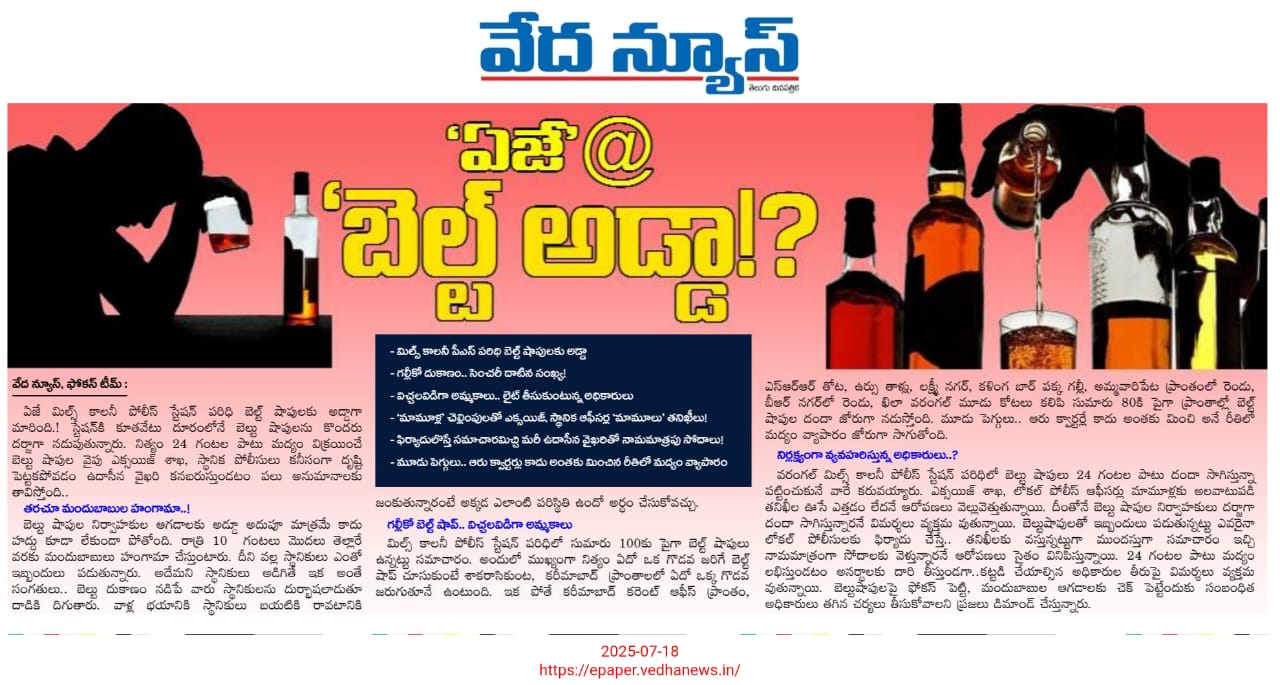 జులై 18, 2025 న వేద న్యూస్ తెలుగు దినపత్రిక ప్రధాన సంచికలో ప్రచురించిన కథనానికి స్పందన వచ్చింది. “ఏ జే @బెల్ట్ అడ్డా!?” శీర్షిక న వార్తా కథనం ప్రచురితమయింది.